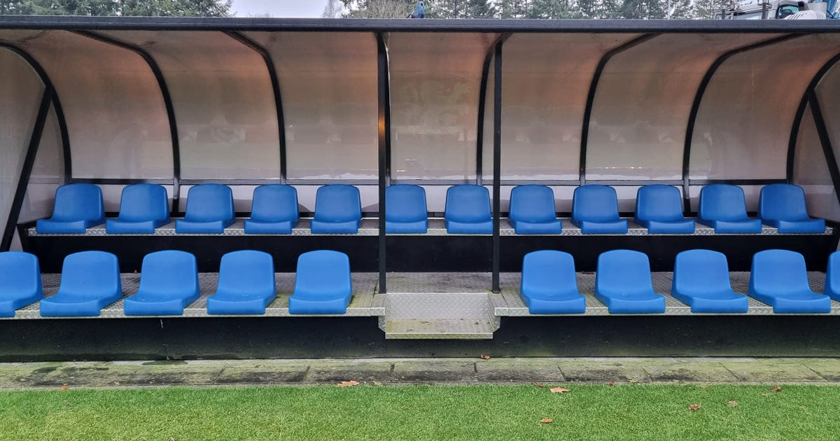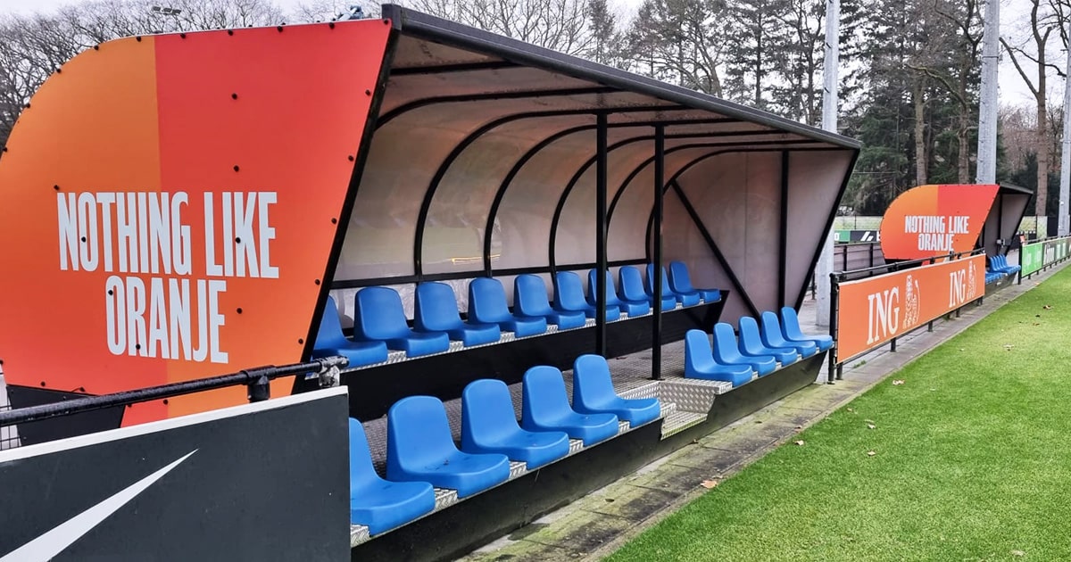 De dug-outs zijn afgestemd op de beperkte ruimte bij de trainingsvelden en bieden optimale capaciteit zonder in te leveren op comfort of uitstraling. Dankzij de blauwe kuipstoelen en branding sluiten de dug-outs perfect aan bij de KNVB-identiteit en de hoogwaardige uitstraling van het complex.
