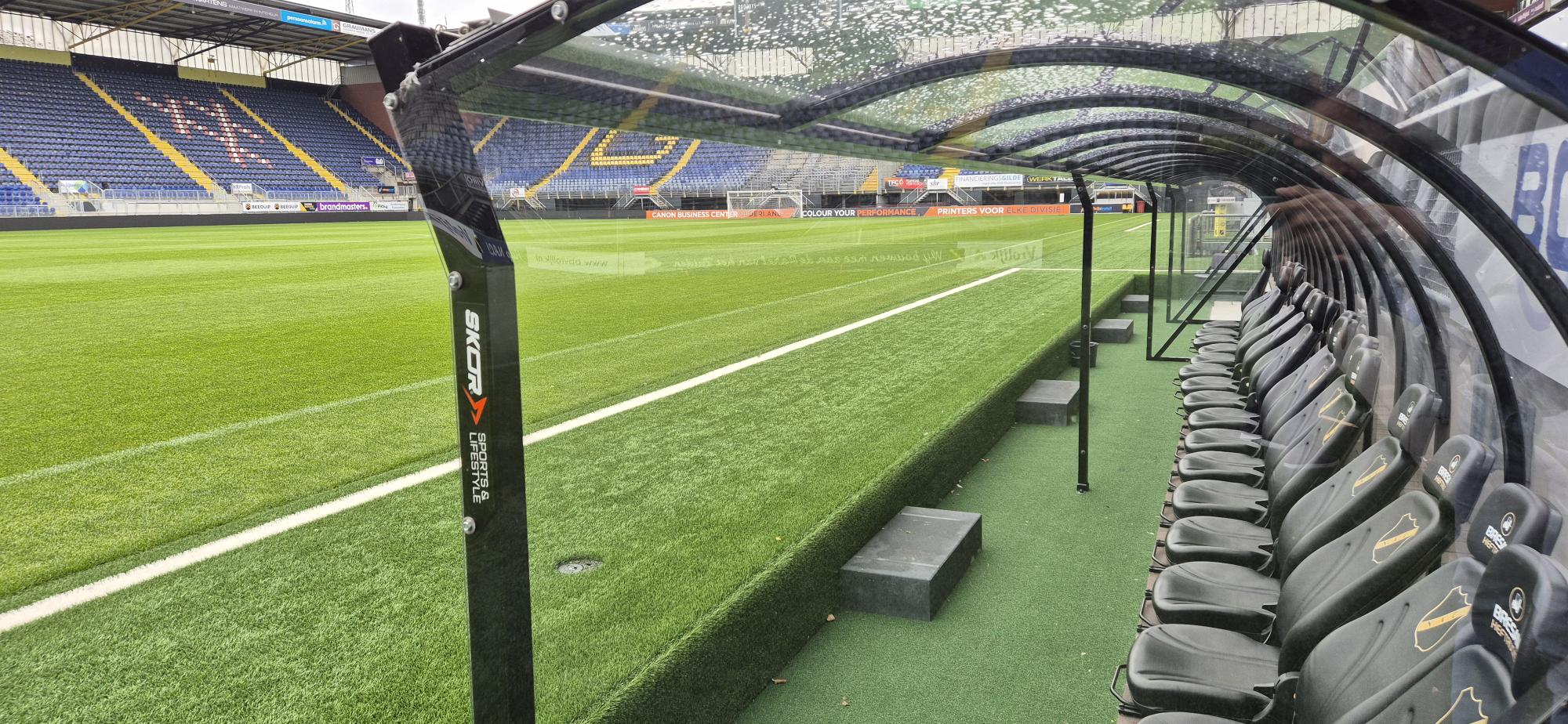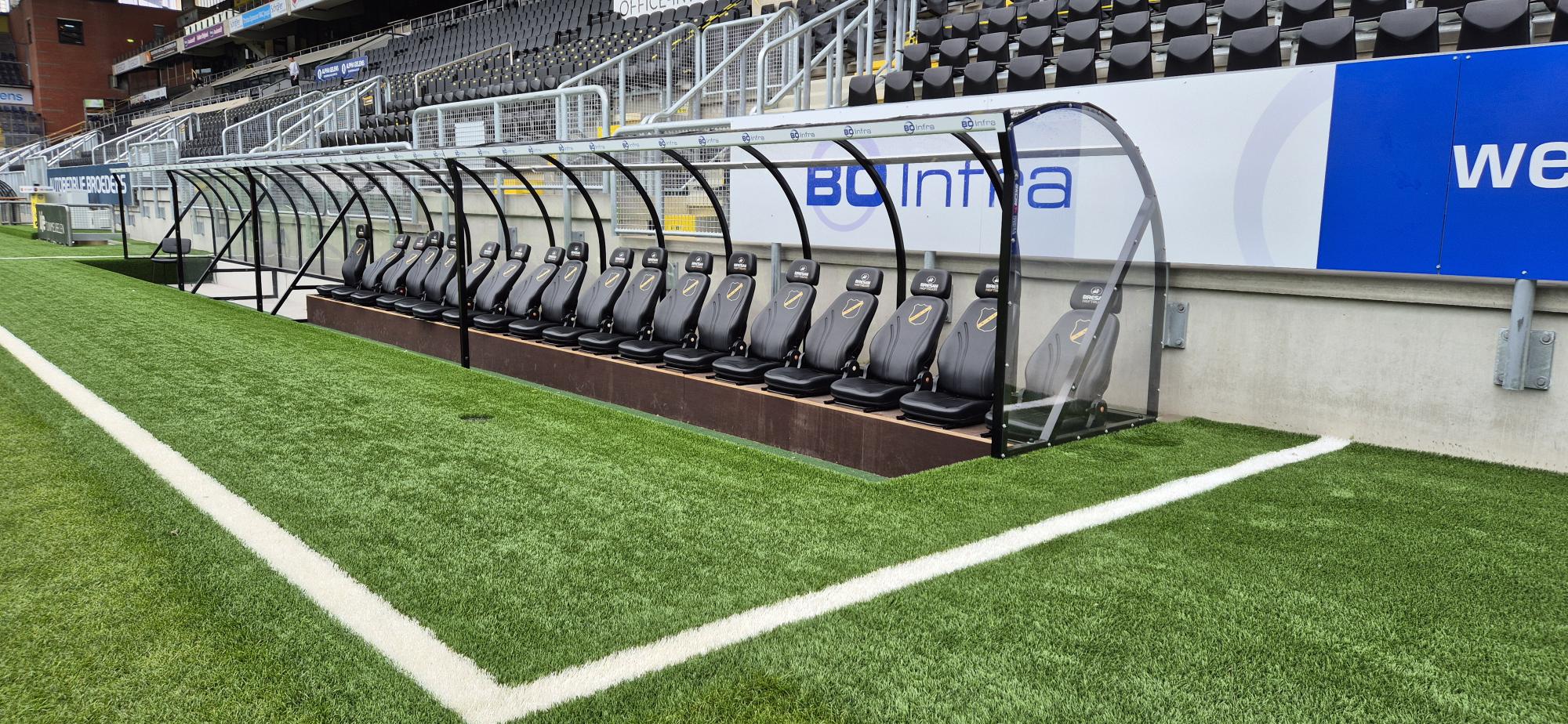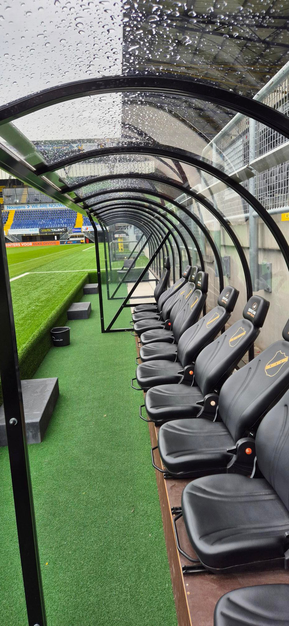 De dug-out van NAC Breda is volledig afgestemd op de specifieke situatie in het stadion. De ruime opzet en de toepassing van tussenschermen zorgen voor overzicht en comfort. Dankzij de montage op een keerwand met kunstgrasafwerking sluit de oplossing perfect aan bij de bestaande infrastructuur.